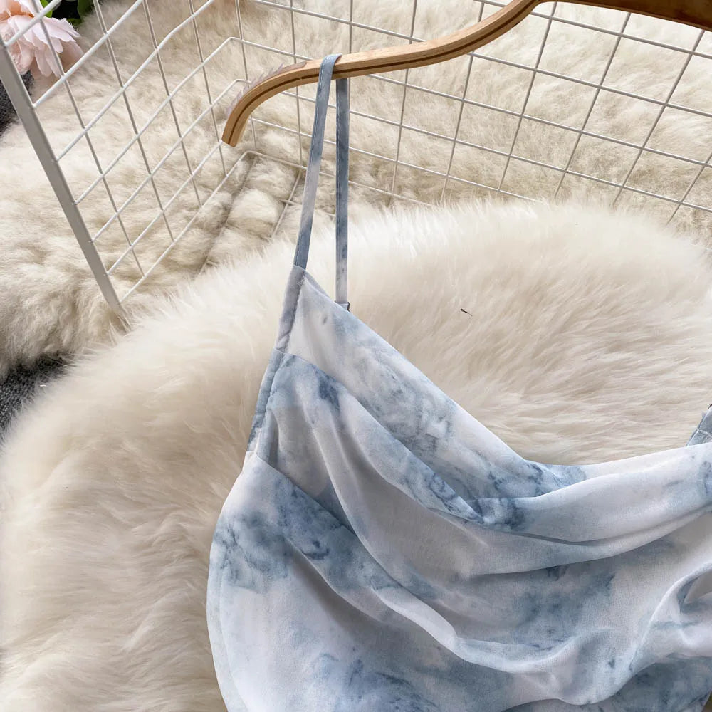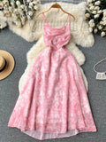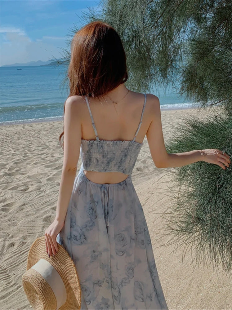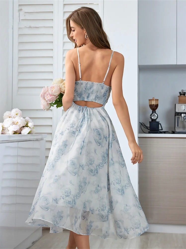 Elegant Floral Spaghetti Strap Ruched Backless Midi Dress